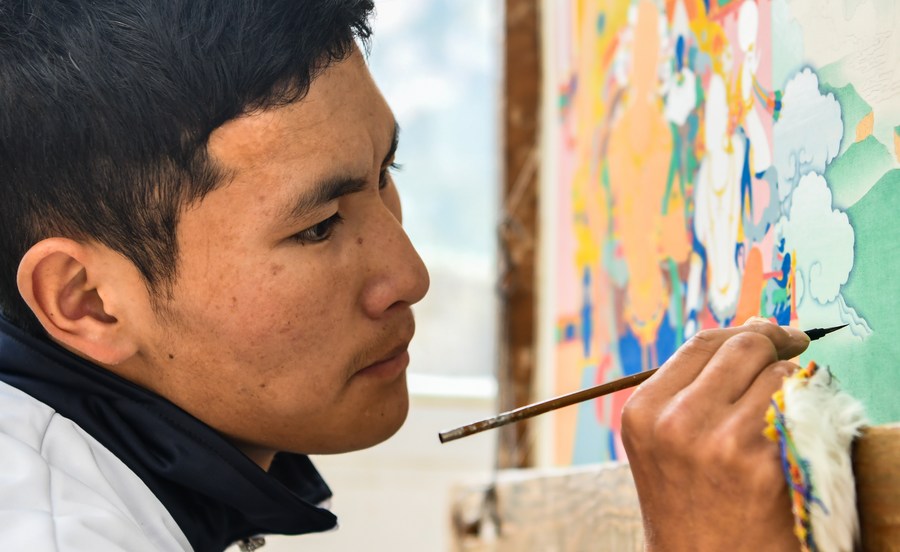 An apprentice practices painting thangka at a training base of ethnic handicrafts making in Kabma Township of Qamdo, southwest China's Tibet Autonomous Region, Oct. 3, 2020. (Xinhua/Jigme Dorje)