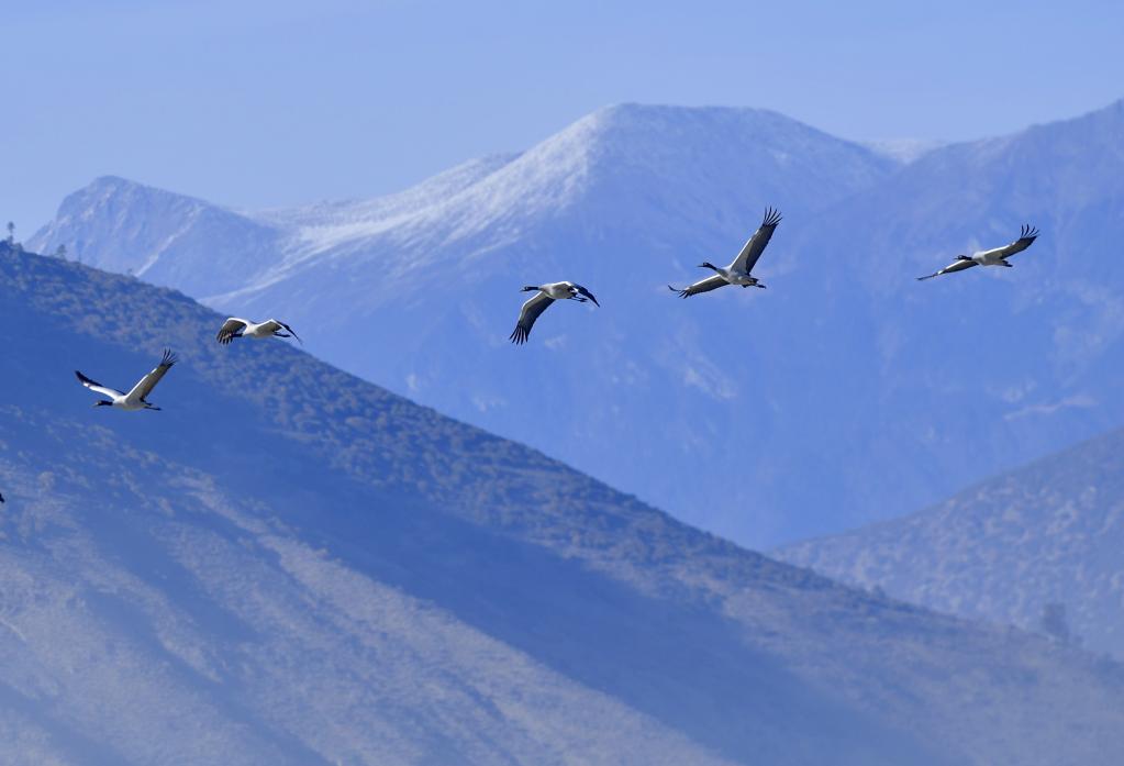 Black-necked cranes fly in Namling County of Xigaze City, southwest China's Tibet Autonomous Region, March 29, 2022. (Xinhua/Zhang Rufeng)