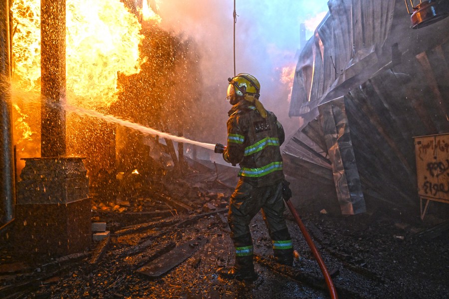 A firefighter tries to extinguish a fire at Al-Mubarakiya market in Kuwait City, Kuwait, on March 31, 2022.