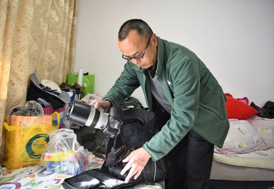 He Xiaoan prepares equipment for observing and photographing birds in southwest China's Sichuan Province, March 23, 2022. (Xinhua/Liu Kun)