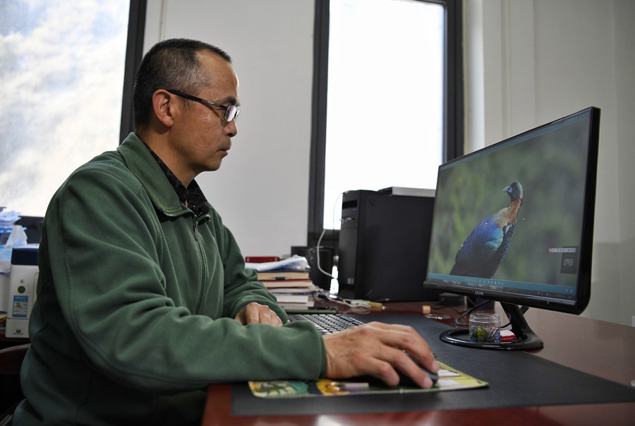He Xiaoan sorts out his photos of birds at his office in Wolong National Nature Reserve, southwest China's Sichuan Province, March 23, 2022. (Xinhua/Liu Kun)■