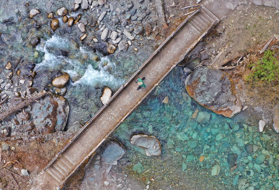 Aerial photo shows He Xiaoan looking for birds in Wolong National Nature Reserve, southwest China's Sichuan Province, March 23, 2022. (Xinhua/Liu Kun)
