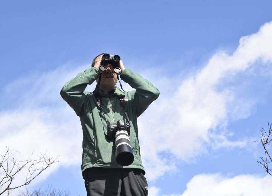 He Xiaoan observes birds with telescope in Wolong National Nature Reserve, southwest China's Sichuan Province, March 23, 2022. (Xinhua/Liu Kun)