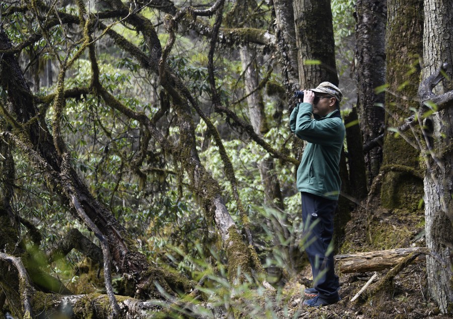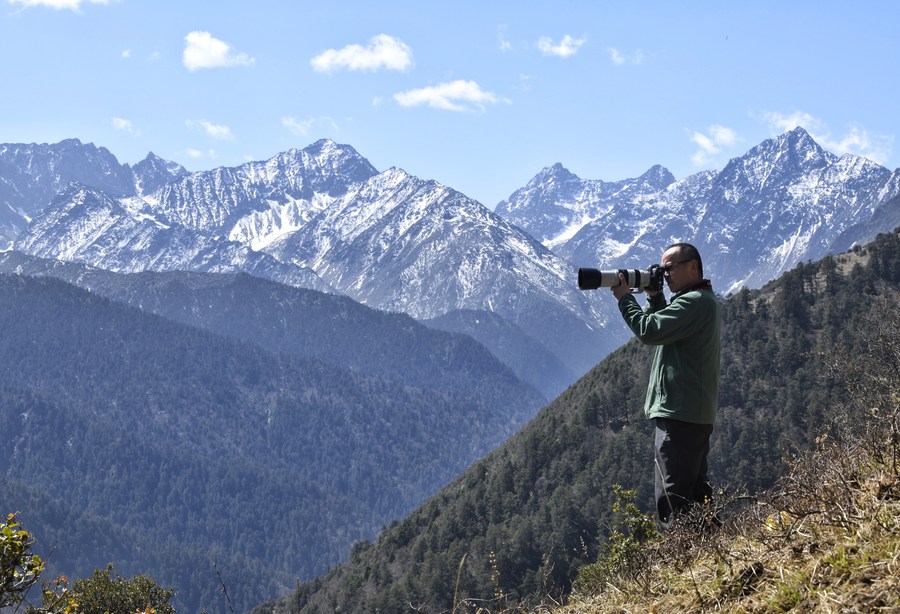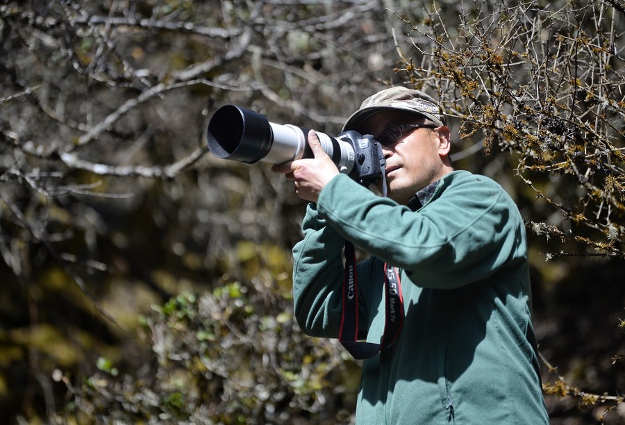 He Xiaoan takes photos of birds in Wolong National Nature Reserve, southwest China's Sichuan Province, March 23, 2022. (Xinhua/Liu Kun)