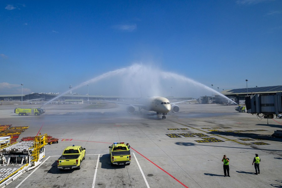 A passenger plane is welcomed by water cannon salute at the Kuala Lumpur International Airport in Sepang of Selangor, Malaysia, April 1, 2022. (Photo by Chong Voon Chung/Xinhua)