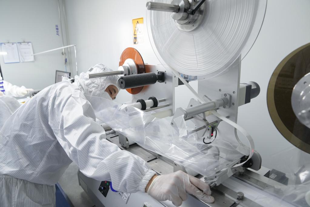 A staff member works at a production line of COVID-19 self-testing kits at Biouhan healthcare company in Hefei, east China's Anhui Province, March 29, 2022. (Xinhua/Du Yu)