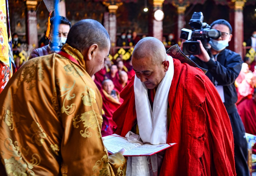 A monk is being awarded the degree of Geshe Lharampa in the Jokhang Temple in Lhasa, capital of southwest China's Tibet Autonomous Region, April 2, 2022. (Xinhua/Jigme Dorje)