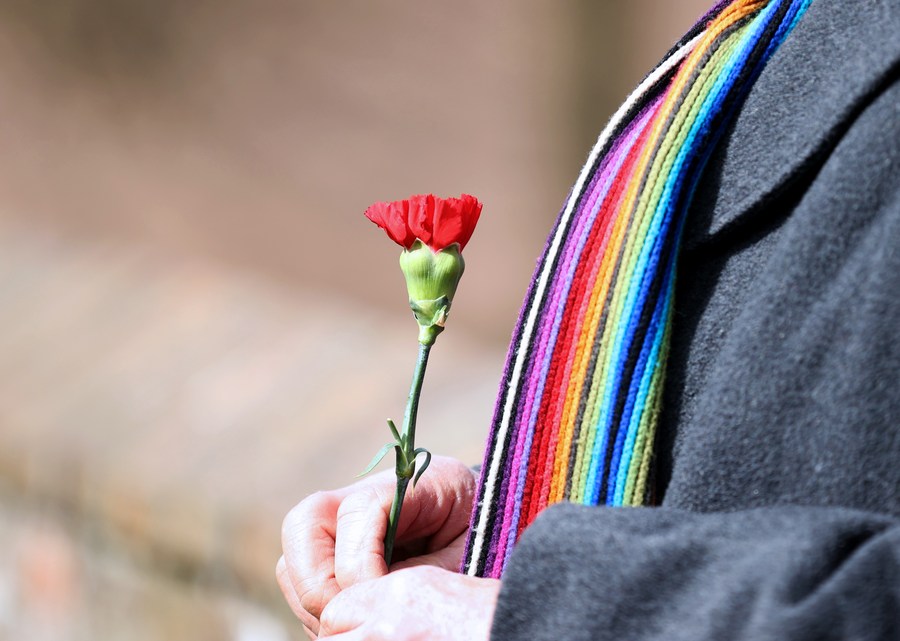 A member of the British Communist Party holds flower in front of Macfarlane's tombstone, hailing her historical contribution in spreading Marxism, in Cheshire, Britain, April 3, 2022. (Xinhua/Li Ying)