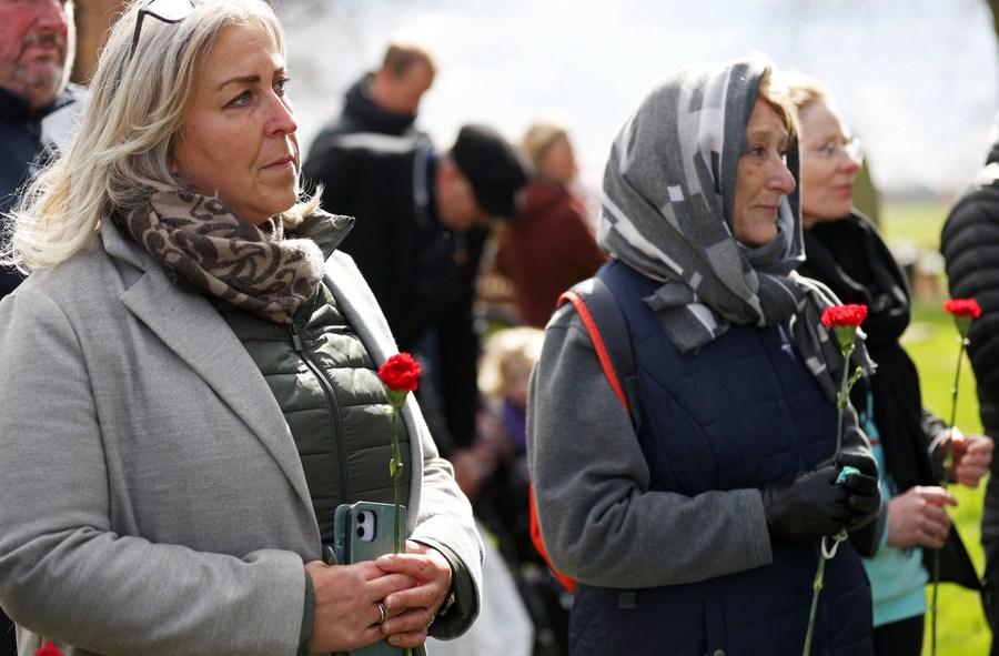 Members of the British Communist Party hold flowers in front of Macfarlane's tombstone, hailing her historical contribution in spreading Marxism, in Cheshire, Britain, April 3, 2022. (Xinhua/Li Ying)