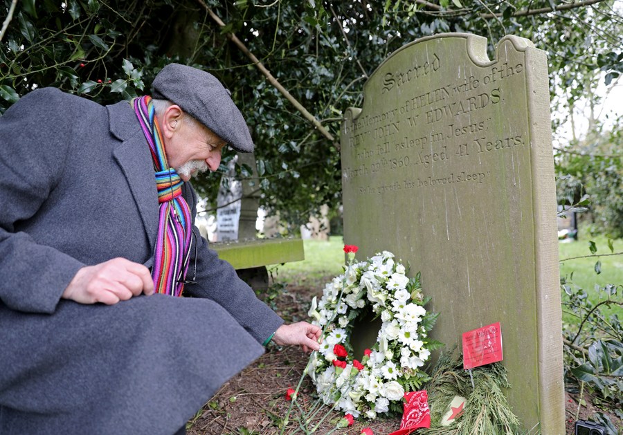 A member of the British Communist Party lays a flower in front of Macfarlane's tombstone, in Cheshire, Britain, April 3, 2022. (Xinhua/Li Ying)