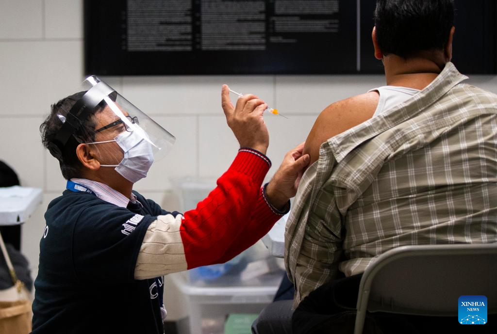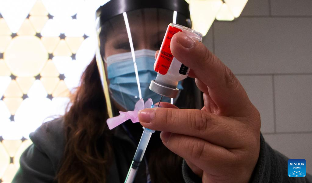 A heath worker administers a dose of COVID-19 vaccine for a recipient at a vaccination clinic in Toronto, Canada, on April 4, 2022. Canada confirmed 10,375 new COVID-19 cases Monday afternoon, elevating its national caseload to 3,510,121 with 37,721 deaths, CTV reported. (Photo by Zou Zheng/Xinhua)