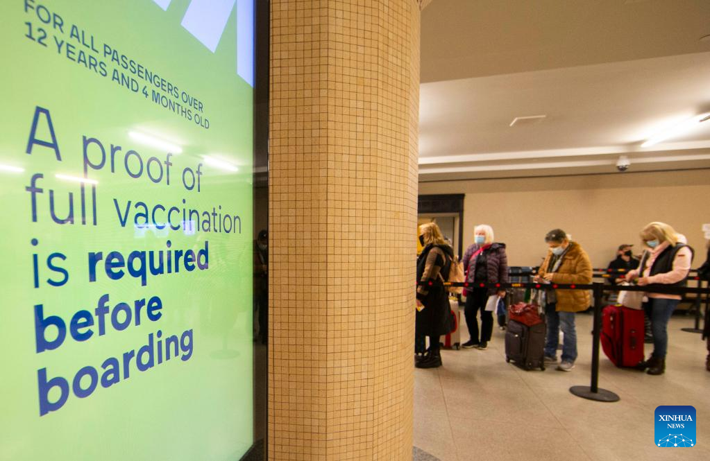 A screen displays a notice to require proof of COVID-19 vaccination for passengers over the age of 12 before boarding at Union Station in Toronto, Canada, on April 4, 2022. Canada confirmed 10,375 new COVID-19 cases Monday afternoon, elevating its national caseload to 3,510,121 with 37,721 deaths, CTV reported. (Photo by Zou Zheng/Xinhua)