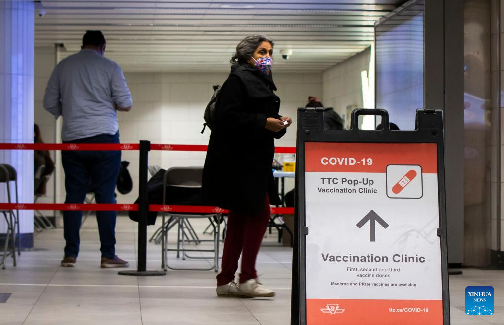 A woman wearing a face mask walks past a COVID-19 vaccination clinic in Toronto, Canada, on April 4, 2022. Canada confirmed 10,375 new COVID-19 cases Monday afternoon, elevating its national caseload to 3,510,121 with 37,721 deaths, CTV reported. (Photo by Zou Zheng/Xinhua)