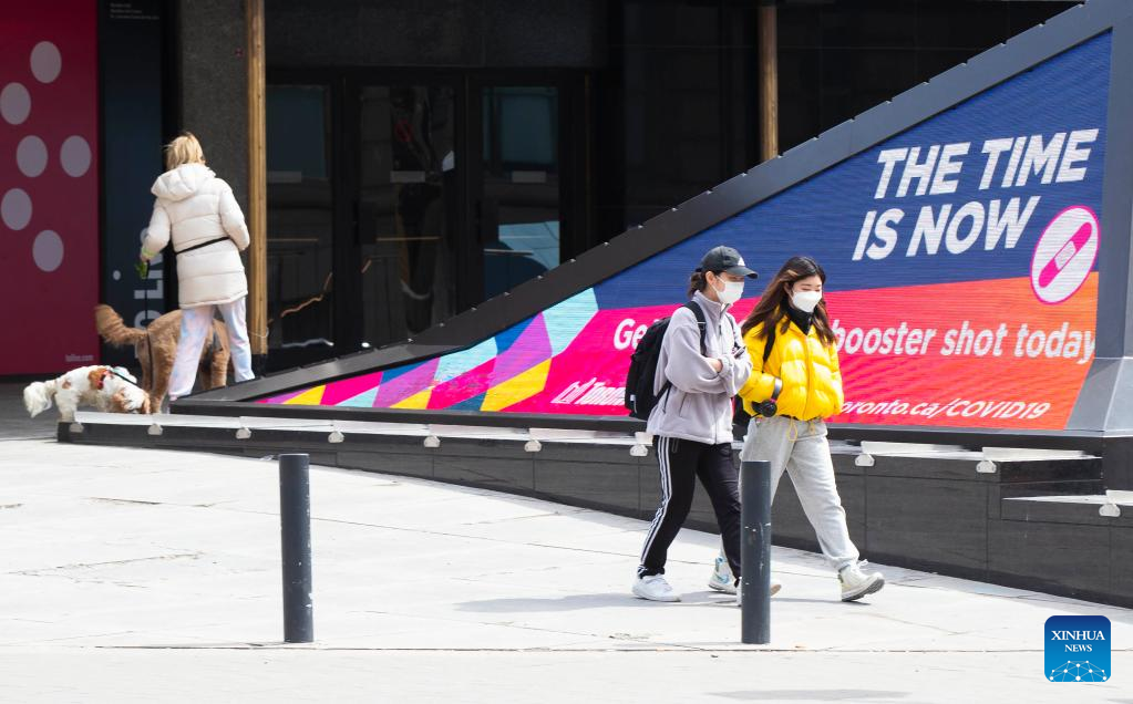People wearing face masks walk past a screen displaying the COVID-19 vaccination information in Toronto, Canada, on April 4, 2022. Canada confirmed 10,375 new COVID-19 cases Monday afternoon, elevating its national caseload to 3,510,121 with 37,721 deaths, CTV reported. (Photo by Zou Zheng/Xinhua)