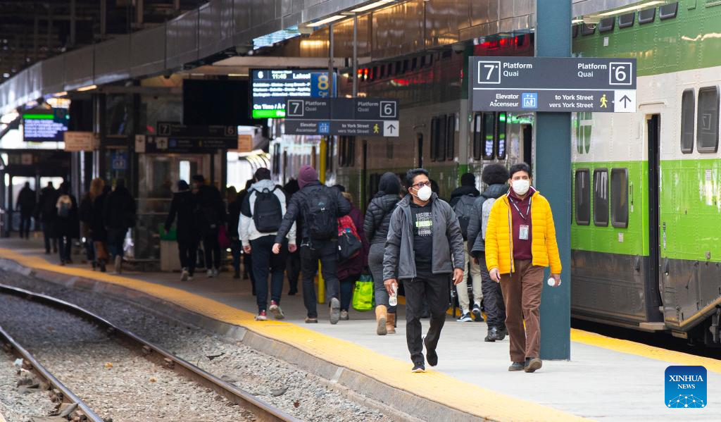 Passengers wearing face masks walk on the platform at Union Station in Toronto, Canada, on April 4, 2022. Canada confirmed 10,375 new COVID-19 cases Monday afternoon, elevating its national caseload to 3,510,121 with 37,721 deaths, CTV reported. (Photo by Zou Zheng/Xinhua)