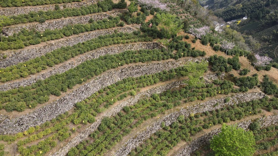 Aerial photo taken on March 24, 2022 shows a view of a terraced tea garden in Wugongling Village of Shexian County, east China's Anhui Province. (Xinhua/Zhang Duan)