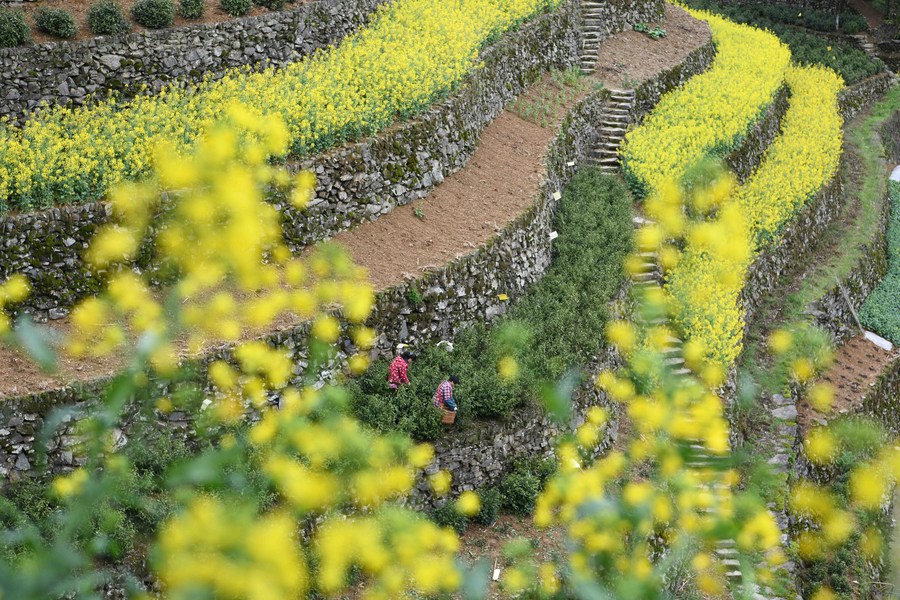 HEFEI, April 7 (Xinhua) -- Ascending the stone steps of a terraced tea garden, Fang Dongyu, 68, is busy picking fresh tea leaves with other villagers as the harvest season of spring tea has started.