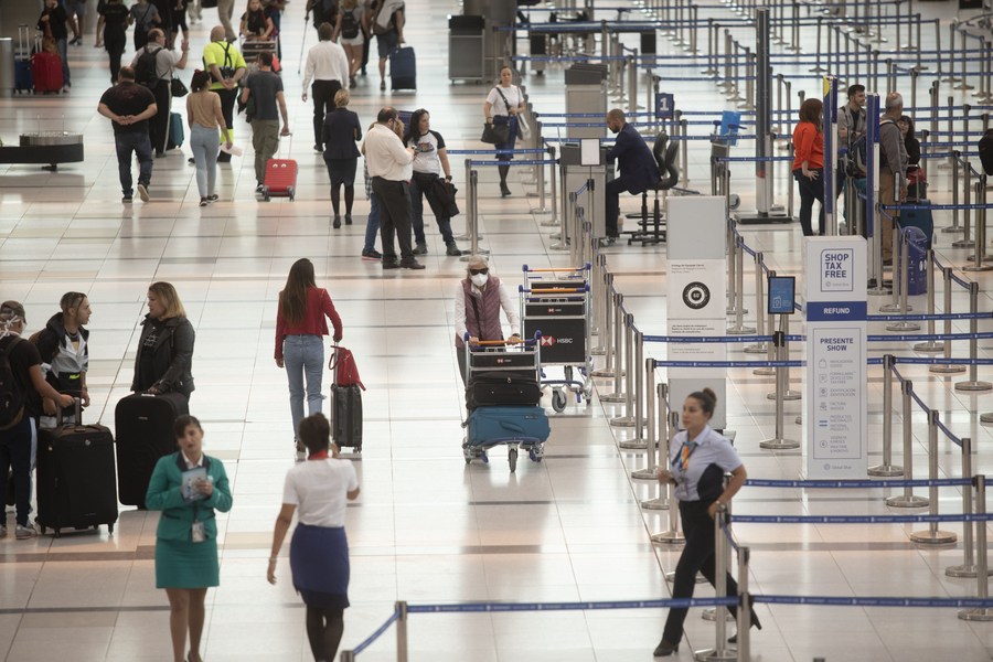 Passengers and employees walk at the Ministro Pistarini International Airport in Ezeiza, Argentina, March 12, 2020. (Xinhua/Martin Zabala)