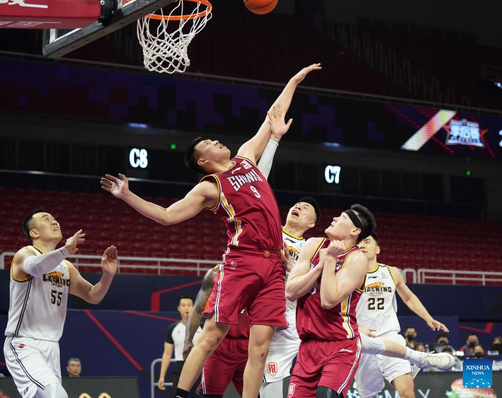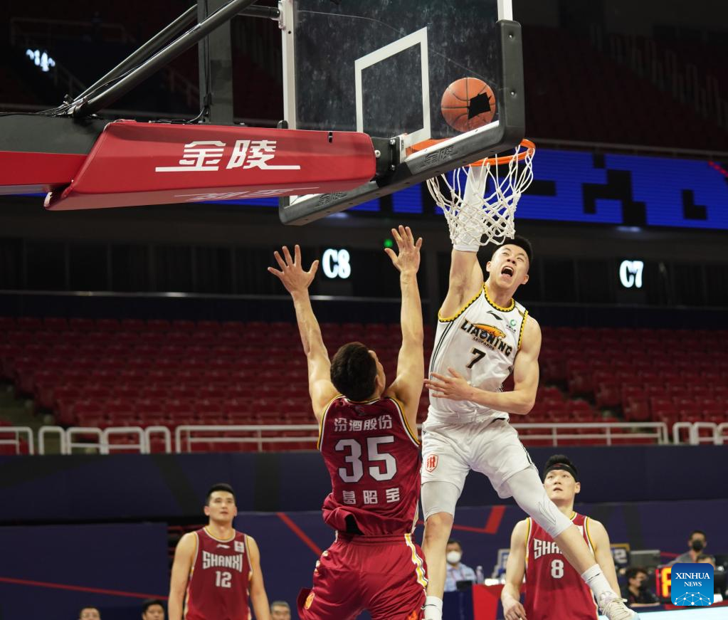 Zhang Zhenlin (top R) of Liaoning Flying Leopards goes for a basket during the 2nd round playoff match between Liaoning Flying Leopards and Shanxi Loongs at the 2021-2022 season of the Chinese Basketball Association (CBA) league in Nanchang, east China's Jiangxi Province, April 7, 2022. (Xinhua/Hu Chenhuan)