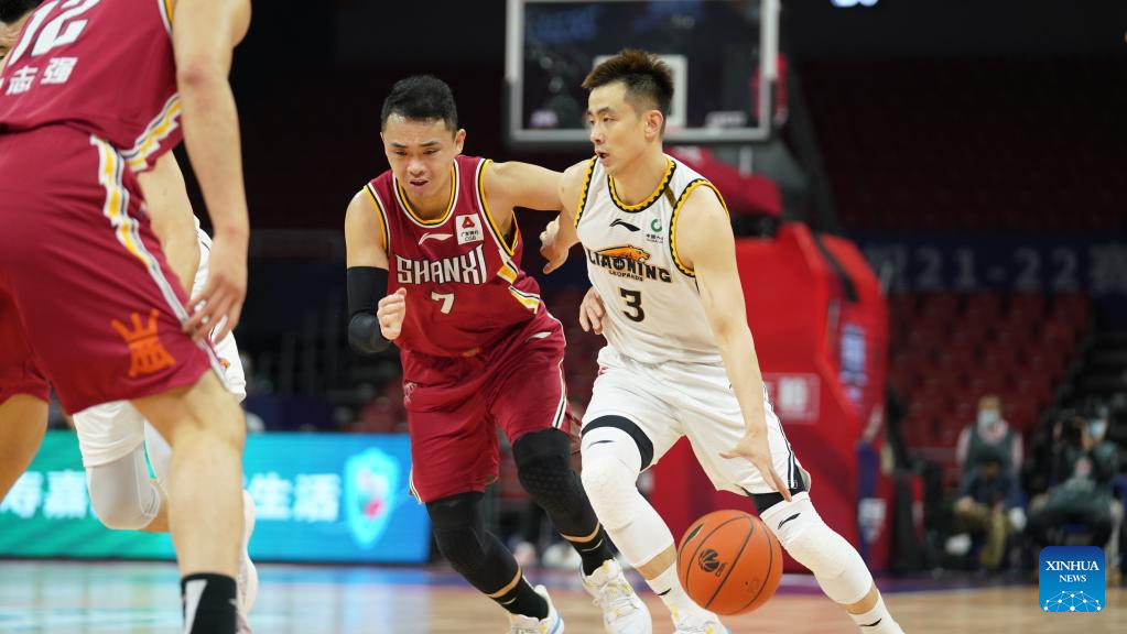 Zhao Jiwei (R) of Liaoning Flying Leopards competes during the 2nd round playoff match between Liaoning Flying Leopards and Shanxi Loongs at the 2021-2022 season of the Chinese Basketball Association (CBA) league in Nanchang, east China's Jiangxi Province, April 7, 2022. (Xinhua/Hu Chenhuan)