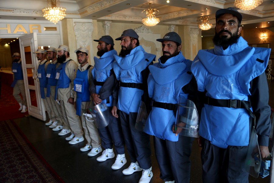 Afghan Sappers attend a press conference on the International Day for Mine Awareness and Assistance in Mine Action in Kabul, Afghanistan, April 6, 2022. (Photo by Saifurahman Safi/Xinhua)