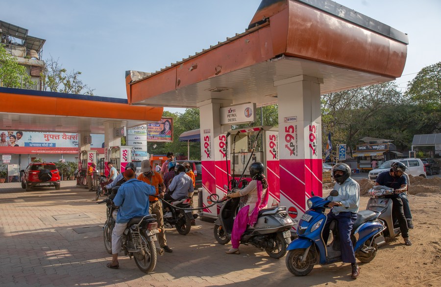 People wait to get their motorcycles refueled at a gas station in New Delhi, April 6, 2022. (Xinhua/Javed Dar)