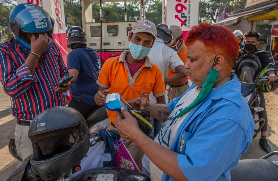 A man pays to refuel his motorcycle at a gas station in New Delhi, April 6, 2022. (Xinhua/Javed Dar)
