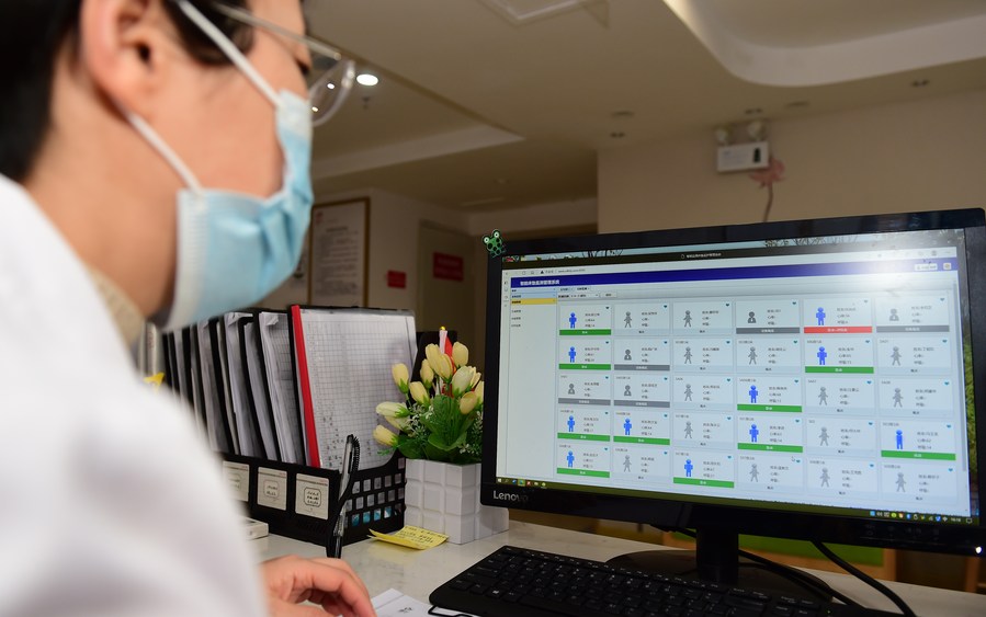Photo taken on Dec. 18, 2021 shows a staffer checking the sleeping conditions of the senior citizens via an intelligent mattress monitoring management system at a smart elderly care center of Qingyuan Community, Luyang District of Hefei City, east China's Anhui Province. (Ge Chuanhong/Handout via Xinhua)