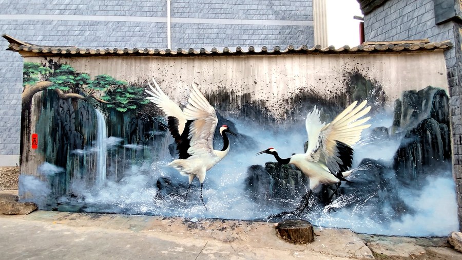 In addition to lotus flowers, cranes and pine trees -- cultural elements that are the locals' favorites -- Liu also borrowed some highlights from "China chic" including Ne Zha from the namesake Chinese animated film, pandas and fairies in ancient costumes. His imaginatively designed artworks always attract curious rural children who crane their necks to see his painting.