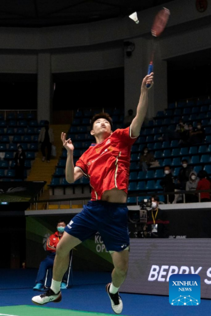 Weng Hongyang of China hits a return during the men's singles semifinal against Victor Svendsen of Denmark at the BWF Korea Open Badminton Championships 2022 in Suncheon, South Korea, April 9, 2022. (Photo by James Lee/Xinhua)