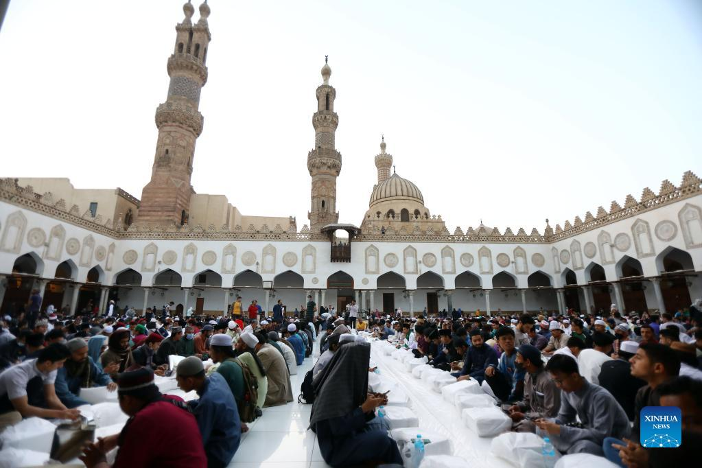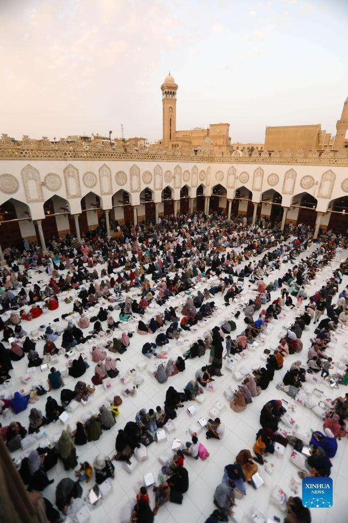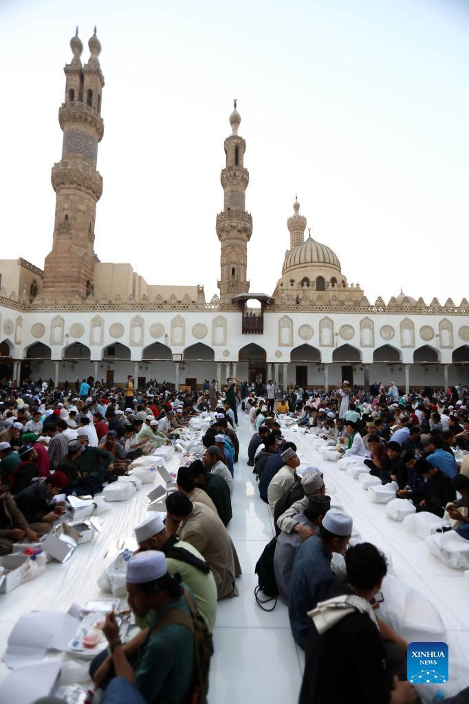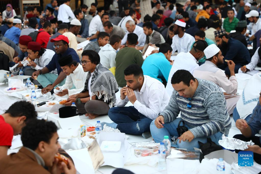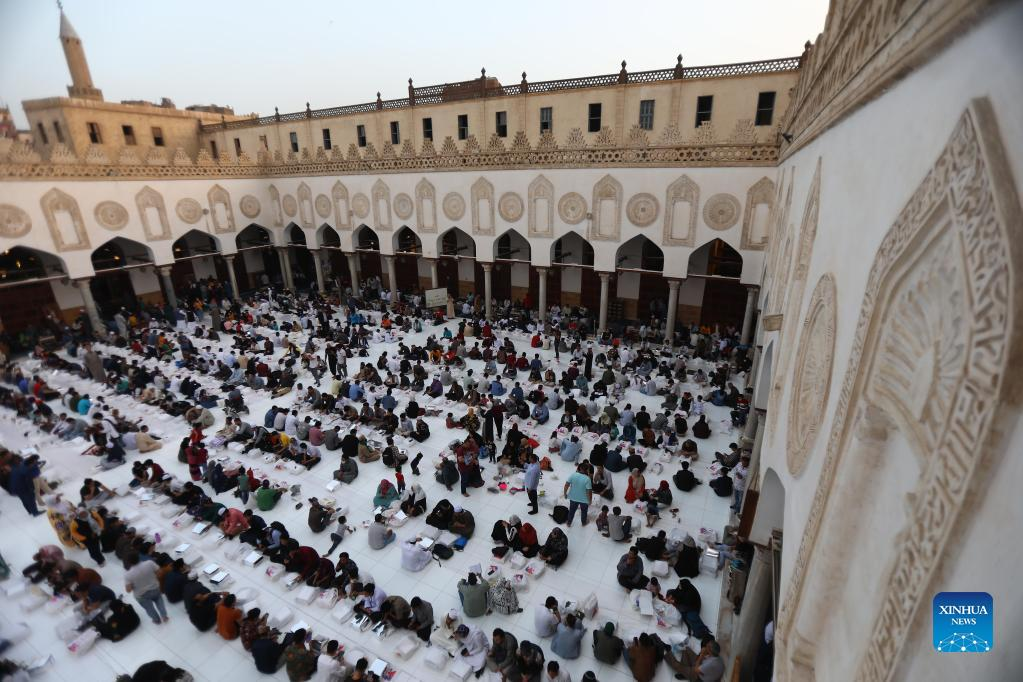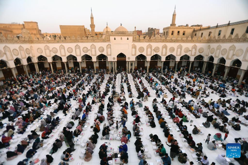 Egyptian Muslims have their iftar, the fast breaking meal, during the holy month of Ramadan at the Al-Azhar Mosque in Cairo, Egypt, April 8, 2022. (Xinhua/Ahmed Gomaa)
