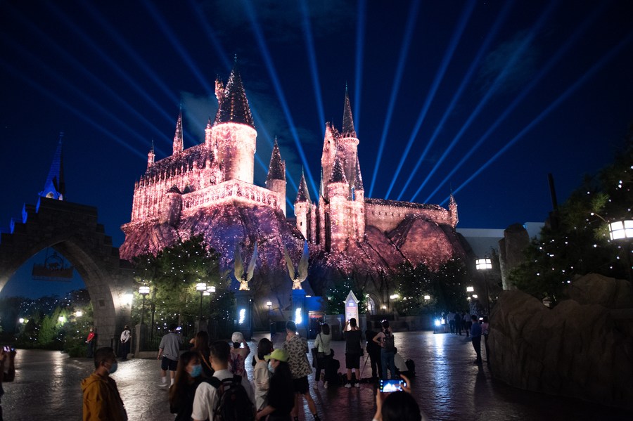 Photo taken on Aug. 25, 2021 shows a light show at the Universal Beijing Resort (UBR) in Beijing, capital of China. (Xinhua/Chen Zhonghao)