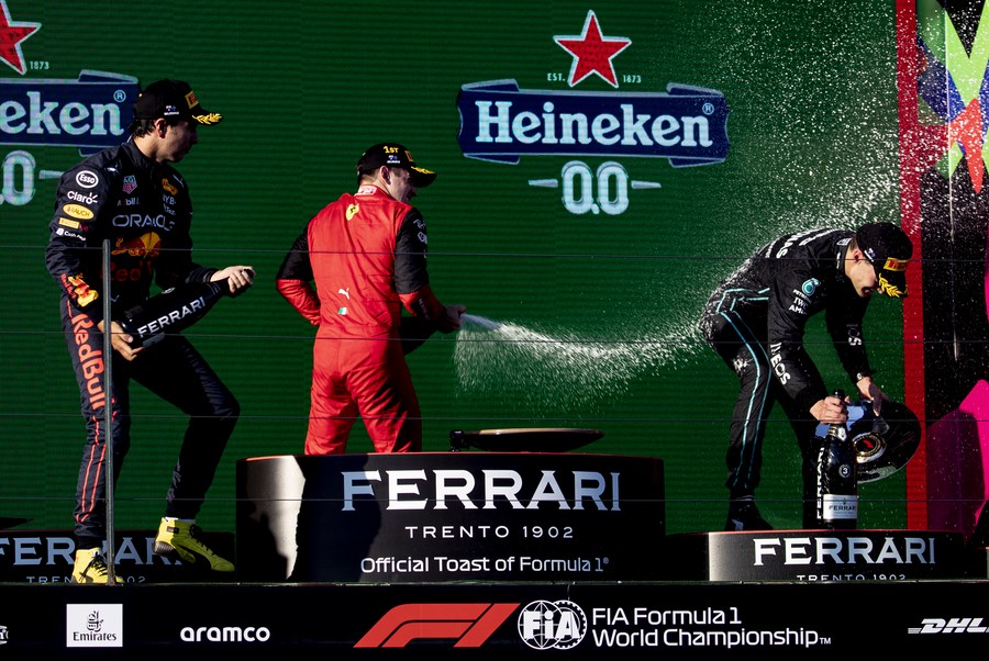 Ferrari's driver Charles Leclerc (C) of Monaco, Red Bull's driver Sergio Perez (L) of Mexico and Mercedes' driver George Russell of Britain celebrate during the victory ceremony for Australian Grand Prix F1 Final in Melbourne, Australia, on April 10, 2022. (Xinhua/Bai Xuefei)