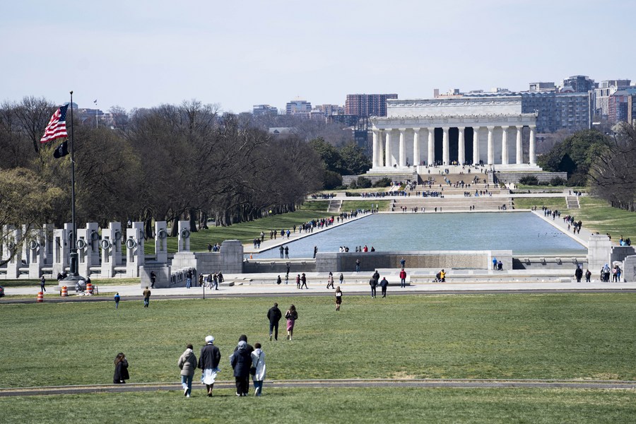 People visit the National Mall in Washington, D.C., the United States, on March 29, 2022.(Xinhua/Liu Jie)