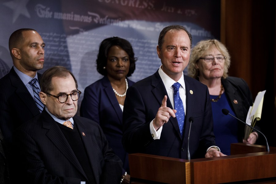 U.S. House Intelligence Committee Chairman Adam Schiff (2nd R) speaks at a press conference during the Senate impeachment trial on Capitol Hill in Washington, D.C., the United States, on Jan. 25, 2020. (Photo by Ting Shen/Xinhua)