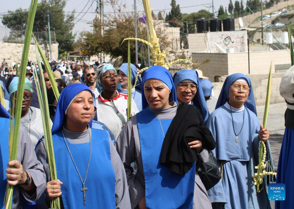 Christians take part in Palm Sunday celebrations in Jerusalem on April 10, 2022. Palm Sunday, a Christian feast that falls on the Sunday before Easter, marks the beginning of the Holy Week. (Xinhua/Shang Hao)