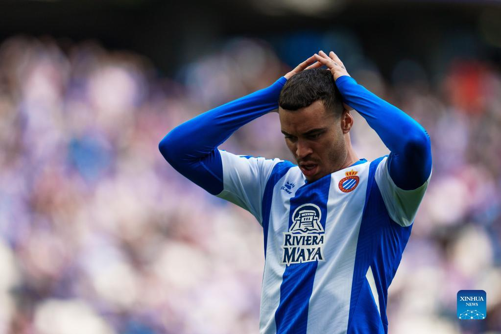 Espanyol's Raul de Tomas reacts during a La Liga match between RCD Espanyol and RC Celta in Cornella, Spain, April 10, 2022. (Photo by Joan Gosa/Xinhua)