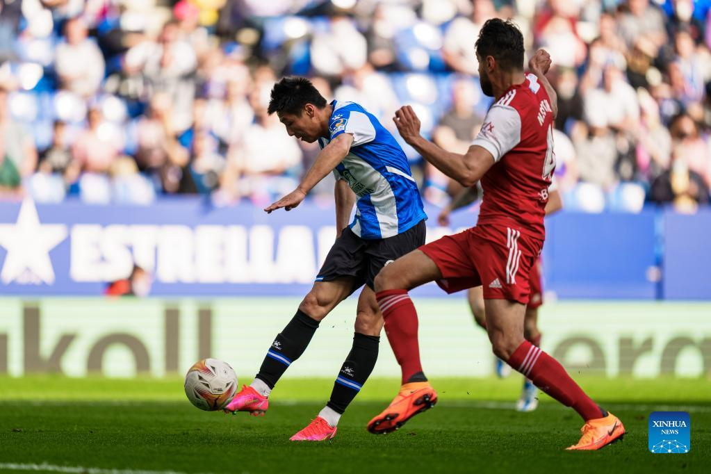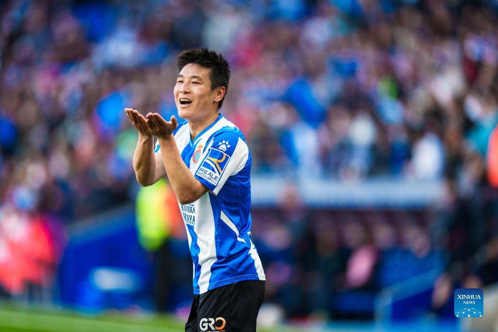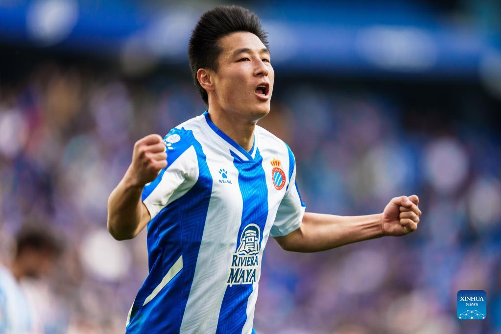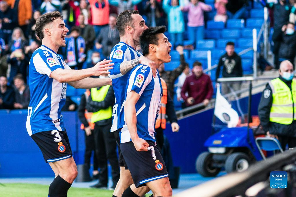 Espanyol's Wu Lei celebrates his goal during a La Liga match between RCD Espanyol and RC Celta in Cornella, Spain, April 10, 2022. (Photo by Joan Gosa/Xinhua)