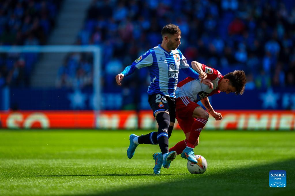 Espanyol's Wu Lei (L) vies with Celta's Javi Galan during a La Liga match between RCD Espanyol and RC Celta in Cornella, Spain, April 10, 2022. (Photo by Joan Gosa/Xinhua)