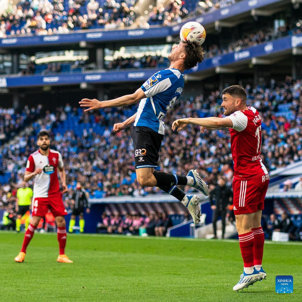 Espanyol's Javi Puado (top) heads the ball during a La Liga match between RCD Espanyol and RC Celta in Cornella, Spain, April 10, 2022. (Photo by Joan Gosa/Xinhua)