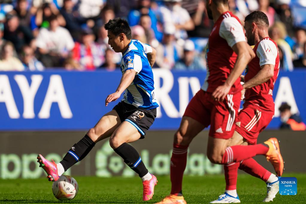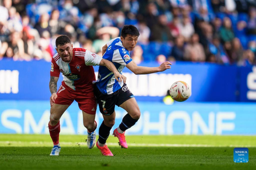 Espanyol's Wu Lei (L) competes during a La Liga match between RCD Espanyol and RC Celta in Cornella, Spain, April 10, 2022. (Photo by Joan Gosa/Xinhua)