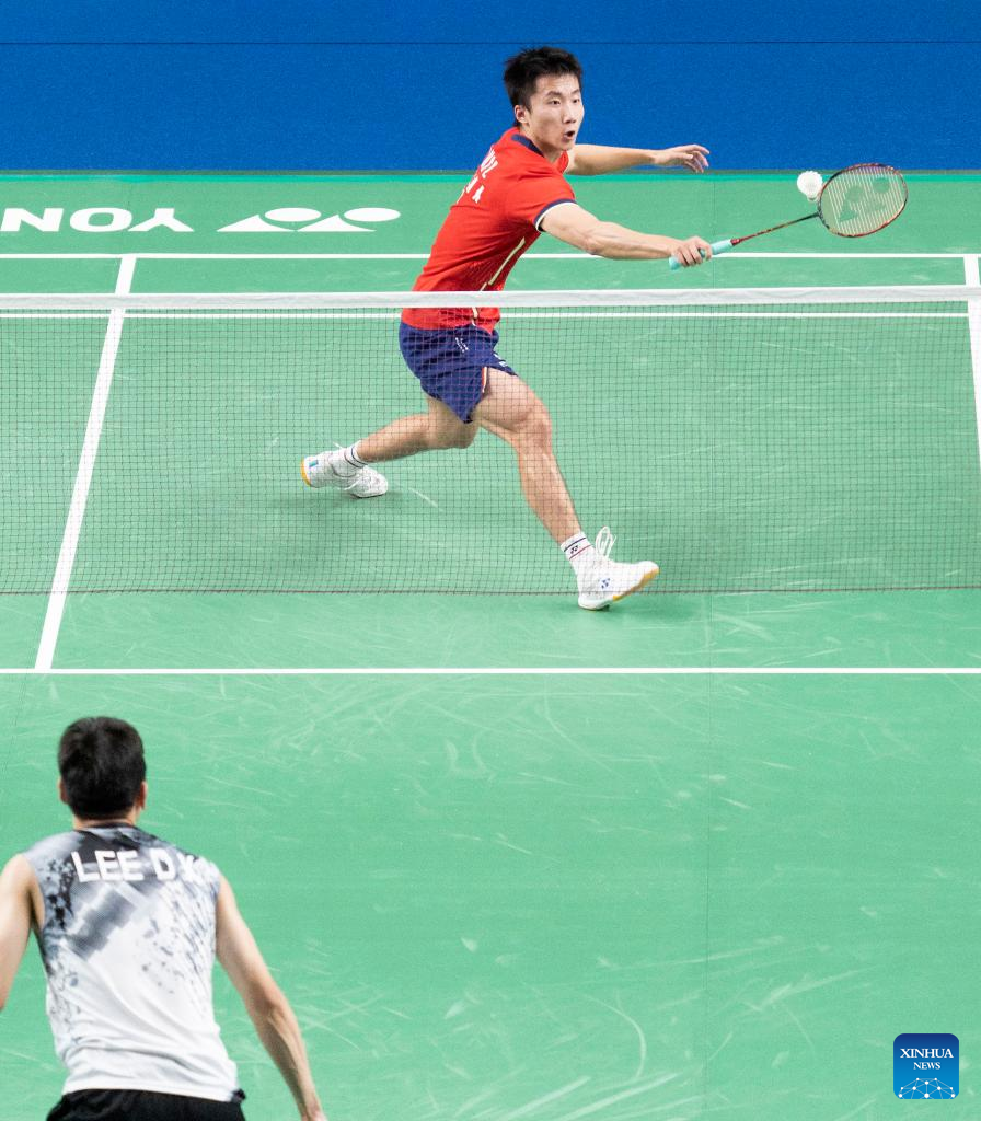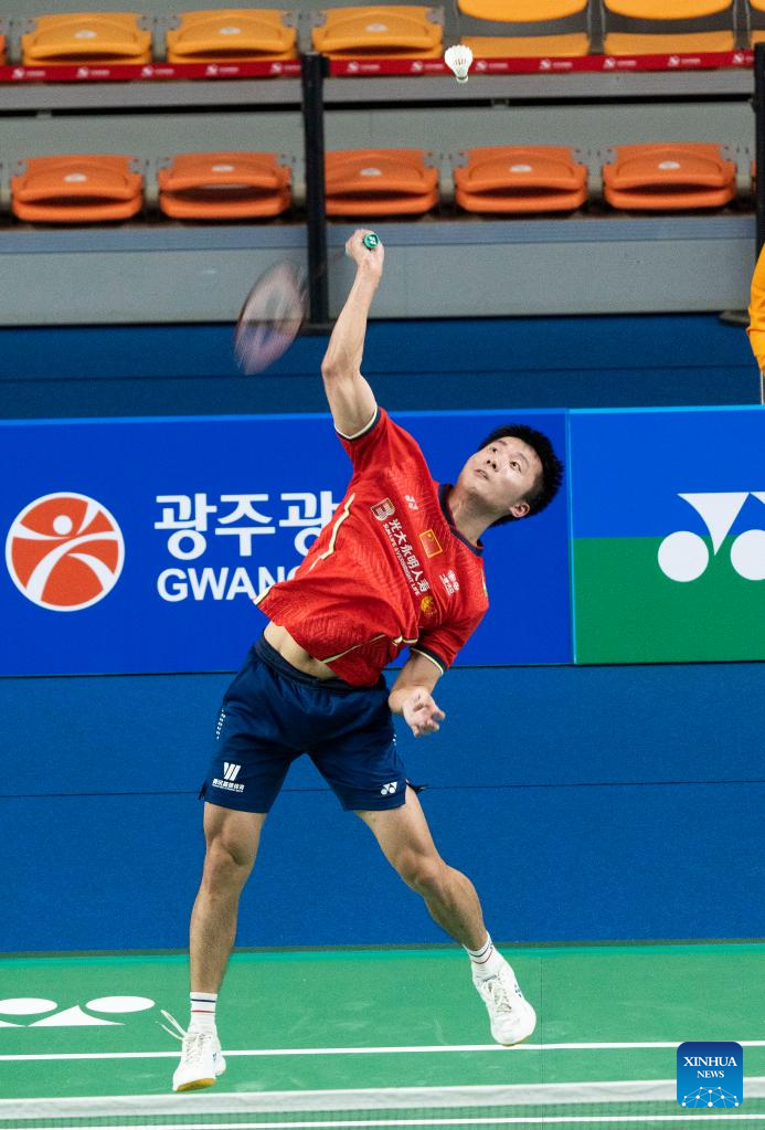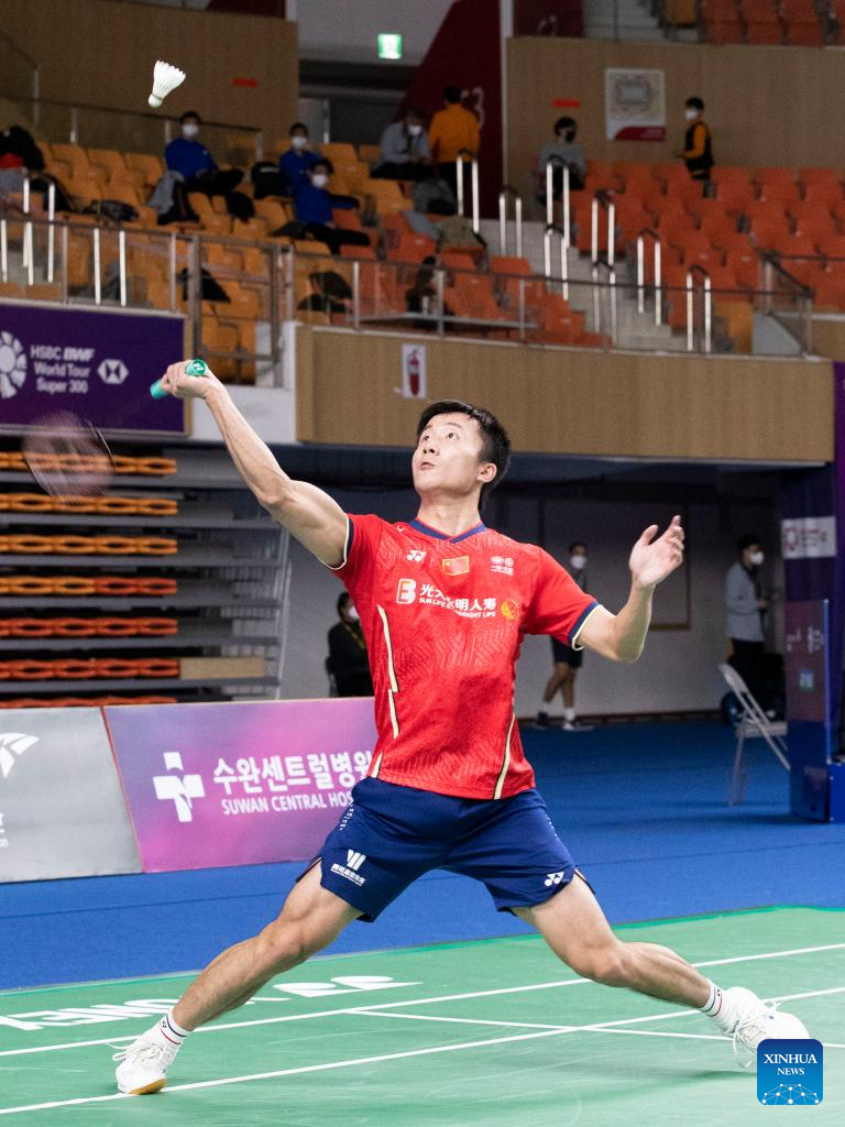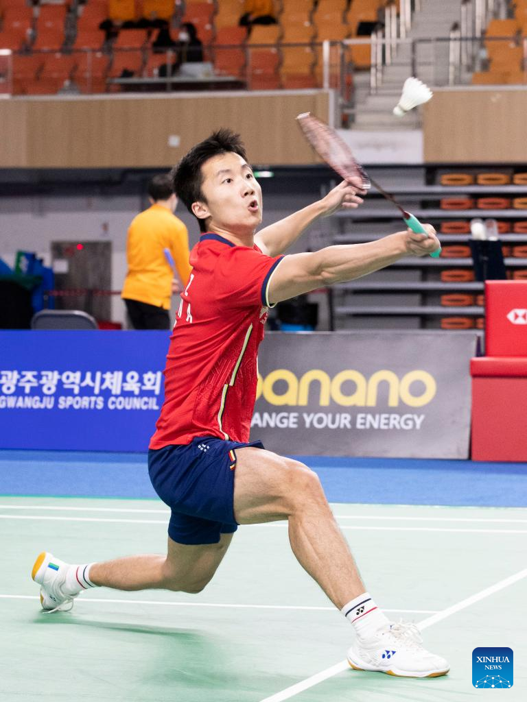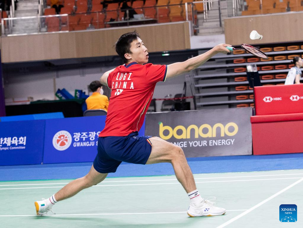 Lu Guangzu of China hits a return during the men's singles first round match against Lee Dong-keun of South Korea at the 2022 Gwangju Yonex Korea Masters in Gwangju, South Korea, April 13, 2022. (Photo by James Lee/Xinhua)