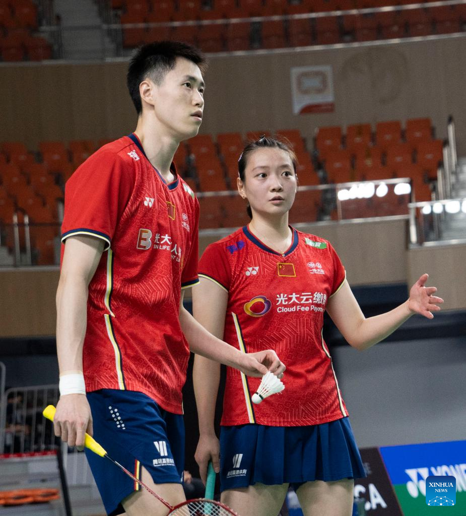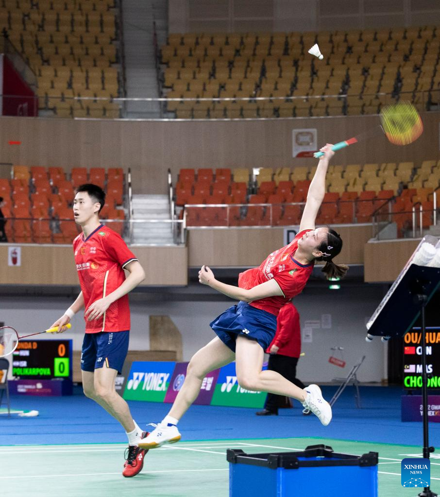 Ou Xuanyi/Huang Yaqiong (L) of China compete during the mixed doubles first round match against Choong Hon Jian/Yap Cheng Wen of Malaysia at the 2022 Gwangju Yonex Korea Masters in Gwangju, South Korea, April 13, 2022. (Photo by James Lee/Xinhua)