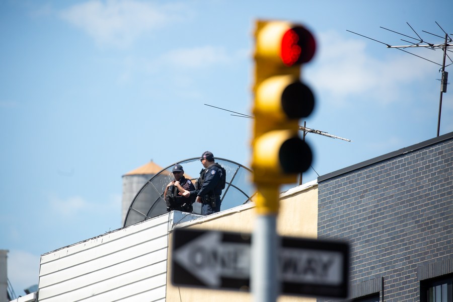 Police stand guard on the top of a nearby building after a shooting took place at a subway station in Brooklyn, New York, the United States, on April 12, 2022. (Photo by Michael Nagle/Xinhua)