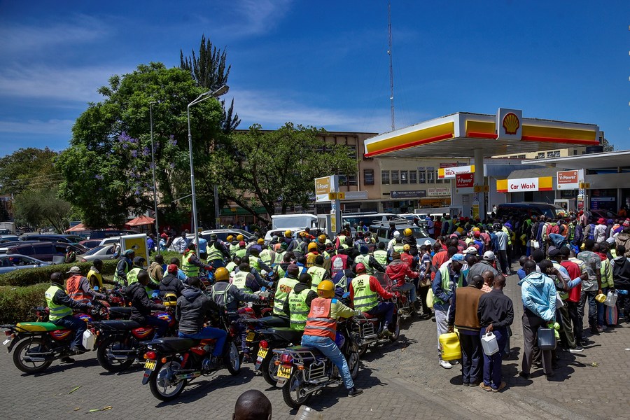 People queue to purchase fuel at a gas station in Nakuru County, Kenya, April 4, 2022. (Photo by Sheikh Maina/Xinhua)