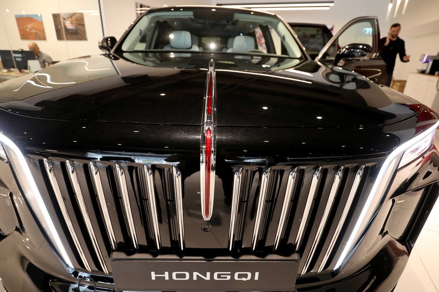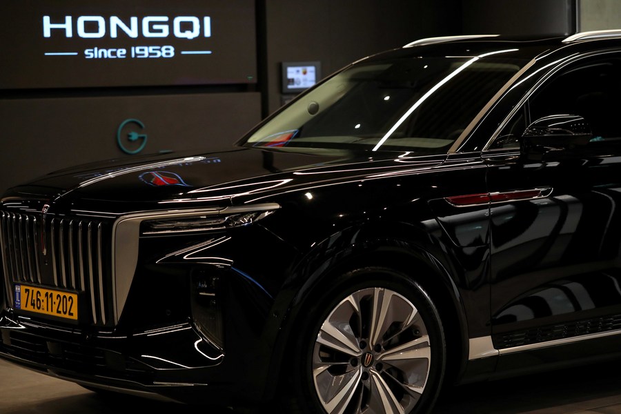 China's Hongqi E-HS9 smart electric SUV is seen at a service in Tel Aviv, Israel, on April 14, 2022. (Photo by Gil Cohen Magen/Xinhua)■