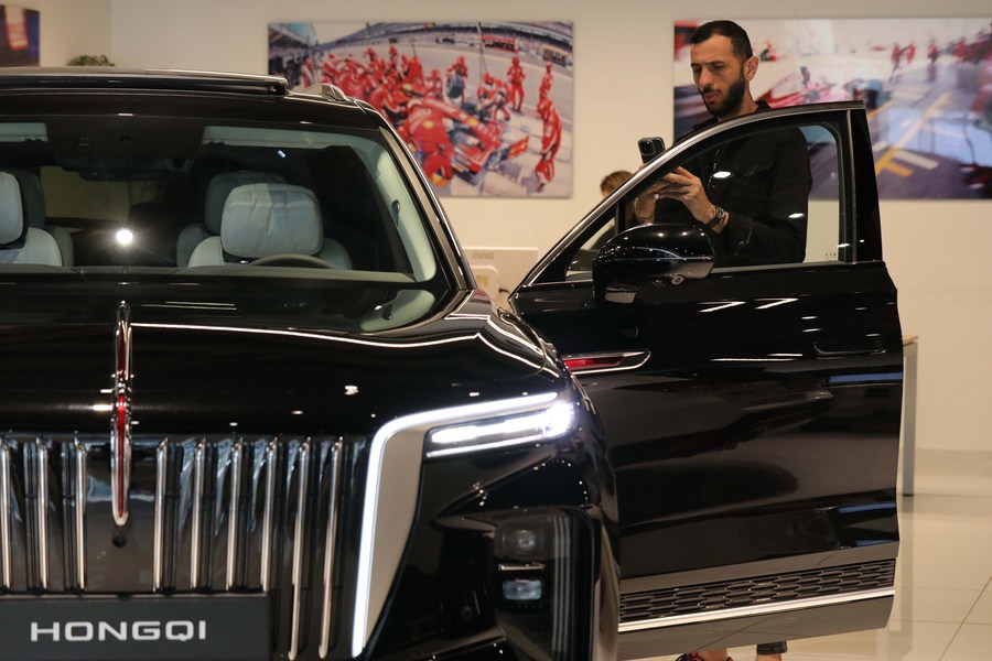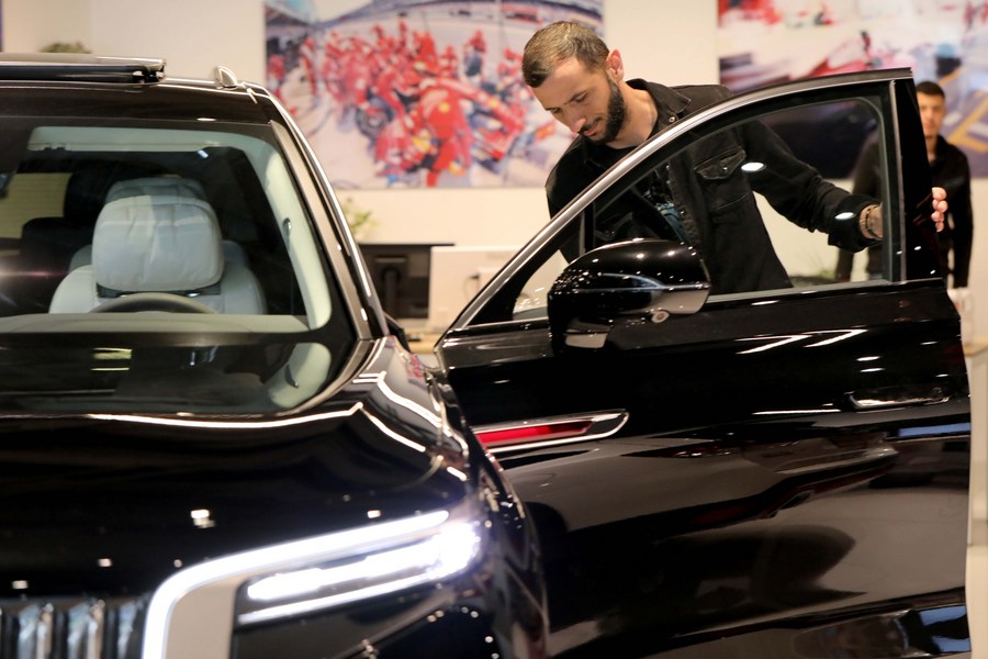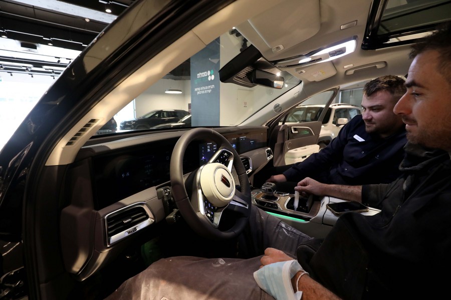 Israeli customers try out China's Hongqi E-HS9 smart electric SUV in Tel Aviv, Israel, on April 14, 2022. (Photo by Gil Cohen Magen/Xinhua)