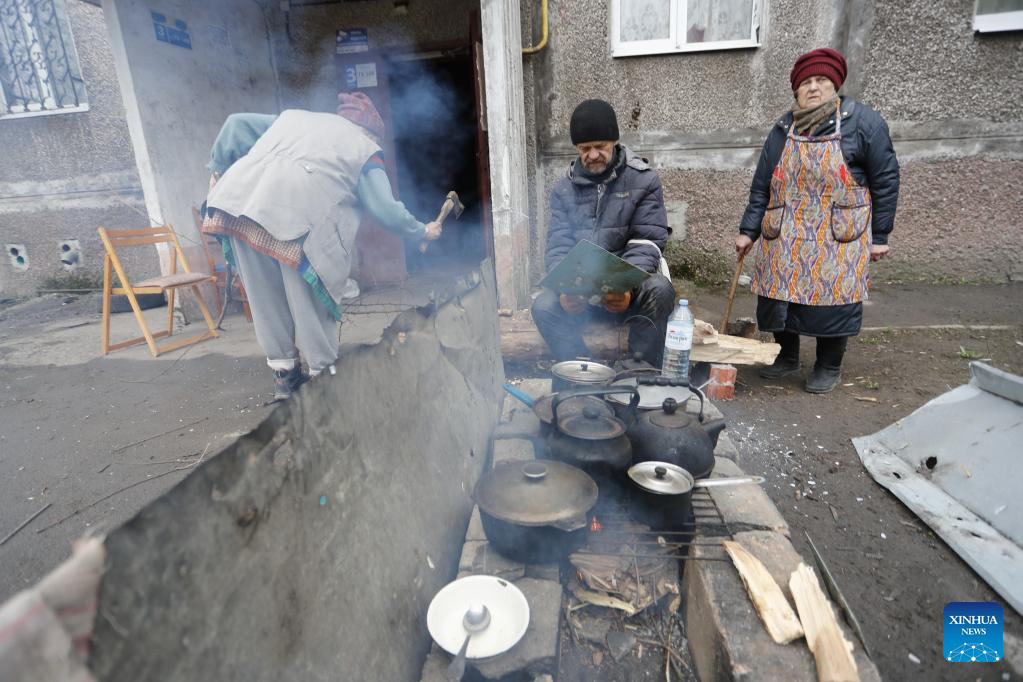 Residents cook outdoors in Mariupol, April 12, 2022. (Photo by Victor/Xinhua)
