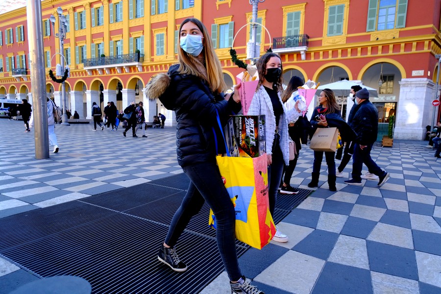A woman carries shopping bags in Nice, southern France, on Dec. 18, 2021. (Photo by Serge Haouzi/Xinhua)