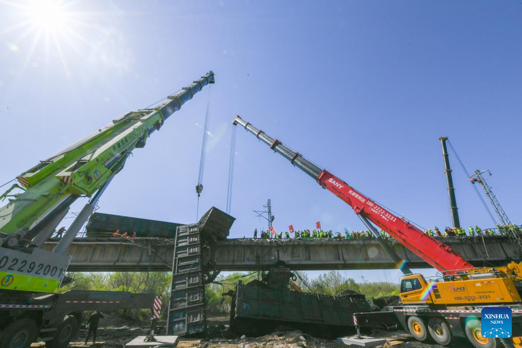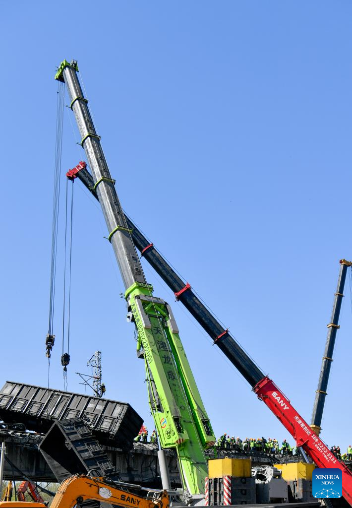 Cranes lift derailed train carriages at the site of a freight train accident in north China's Tianjin, April 15, 2022.